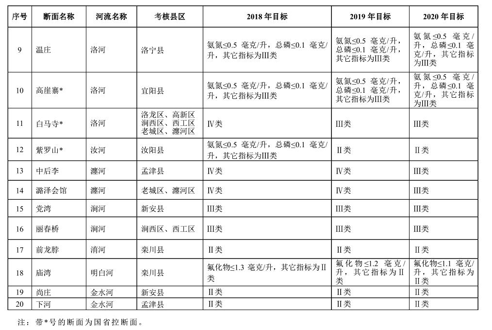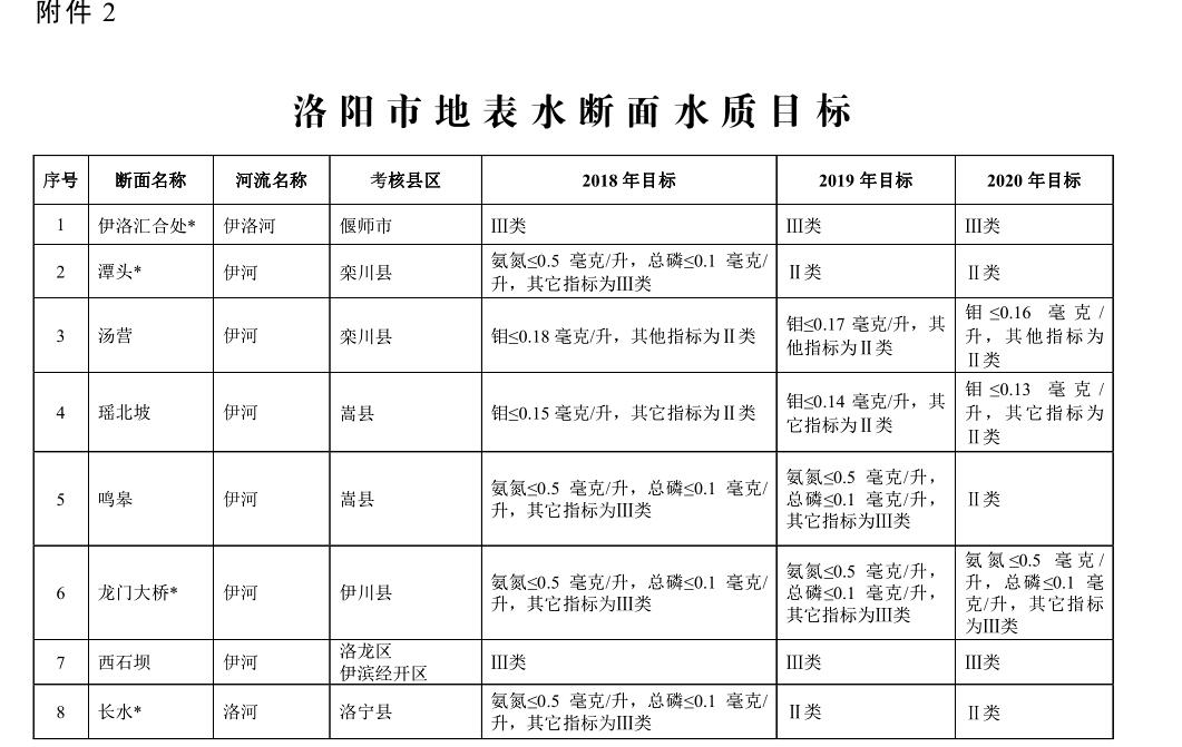 3. 2020 年度目標(biāo) 全市氮氧化物減排 30220 噸,二氧化硫減排 27880 噸。全市 PM 2.5 (細(xì)顆粒物)年均濃度達(dá)到 54 微克/立方米以下,PM 10 (可吸入顆粒物)年均濃度達(dá)到 95 微克/立方米以下,城市區(qū)優(yōu)良天數(shù)達(dá)到 260 天以上。偃師市、孟津縣、新安縣、伊川縣、宜陽(yáng)縣、吉利區(qū) PM 2.5 年均濃度達(dá)到 45 微克/立方米以下,汝陽(yáng)縣、洛寧縣、欒川縣、嵩縣 PM 2.5 年均濃度達(dá)到 35 微克/立方米以下。全市地表水國(guó)、省重點(diǎn)監(jiān)控的 7 個(gè)斷面達(dá)到或優(yōu)于Ⅲ類水質(zhì)斷面比例保持 100%,其中伊河潭頭、洛河長(zhǎng)水、汝河紫羅山斷面水質(zhì)保持或優(yōu)于Ⅱ類;市重點(diǎn)監(jiān)控?cái)嗝孢_(dá)到或優(yōu)于Ⅲ類水質(zhì)斷面比例達(dá)到 100%,其中伊河鳴皋斷面水質(zhì)達(dá)到或優(yōu)于Ⅱ類;全市縣級(jí)以上城市集中式飲用水水源地取水水質(zhì)達(dá)標(biāo)率達(dá)到 100%;全面消除縣城建成區(qū)黑臭水體,基本消除農(nóng)村地區(qū)黑臭水體、坑塘;地下水質(zhì)量考核點(diǎn)位水質(zhì)級(jí)別保持穩(wěn)定。