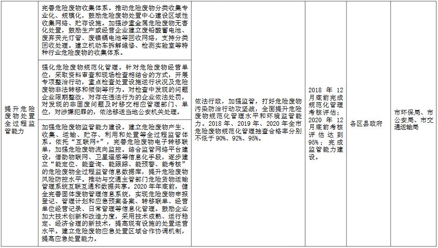 (四)嚴(yán)格環(huán)境監(jiān)管。創(chuàng)新監(jiān)管手段,健全監(jiān)管模式,實(shí)施最嚴(yán)格的全過程環(huán)境監(jiān)管措施,嚴(yán)防危險(xiǎn)廢物非法轉(zhuǎn)移、處置。嚴(yán)格執(zhí)行危險(xiǎn)廢物申報(bào)登記、轉(zhuǎn)移聯(lián)單、經(jīng)營(yíng)許可制度,進(jìn)一步加強(qiáng)危險(xiǎn)廢物規(guī)范化管理。強(qiáng)化危險(xiǎn)廢物跨區(qū)域轉(zhuǎn)移監(jiān)管,嚴(yán)格把控危險(xiǎn)廢物跨省市處置。持續(xù)開展危險(xiǎn)廢物規(guī)范化管理督查考核,定期公布結(jié)果,促進(jìn)環(huán)境監(jiān)管水平不斷提高。加強(qiáng)環(huán)保、公安、交通、安監(jiān)、衛(wèi)生等相關(guān)部門的聯(lián)勤聯(lián)動(dòng),嚴(yán)厲打擊危險(xiǎn)廢物非法排放、轉(zhuǎn)移、傾倒、處置等環(huán)境違法犯罪行為,建立聯(lián)合打擊危險(xiǎn)廢物犯罪長(zhǎng)效機(jī)制。