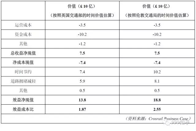 Crossrail伊麗莎白線的效益主要來自交通時(shí)間的節(jié)約和擁堵的減輕,以及事故減少、碳排放減少、空氣質(zhì)量改善、噪音降低等。英國國家交通部和倫敦交通局分別對交通的時(shí)間價(jià)值有參考值,通過比較也可以看出倫敦交通局給出的時(shí)間價(jià)值比英國全國的時(shí)間價(jià)值更高,體現(xiàn)了倫敦更高的收入水平和時(shí)間成本。