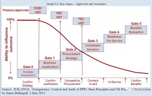 可見,物有所值是PPP項(xiàng)目的核心原則,應(yīng)貫穿在PPP項(xiàng)目實(shí)施的全過程動(dòng)態(tài)管理中,根據(jù)項(xiàng)目關(guān)鍵要素的變化不斷測算、評估和調(diào)整,特別是項(xiàng)目采購和融資交割后,談判簽約的實(shí)際情況往往與項(xiàng)目準(zhǔn)備時(shí)發(fā)生變化,應(yīng)對基于可研報(bào)告和項(xiàng)目實(shí)施方案所做的物有所值評估進(jìn)行核算,同時(shí)在項(xiàng)目實(shí)施期和結(jié)束后的每個(gè)重大變化節(jié)點(diǎn),都應(yīng)開展相應(yīng)的評估工作。英國在PPP項(xiàng)目全過程審查評估中就明確了評估的五個(gè)關(guān)鍵關(guān)口(Gate)。