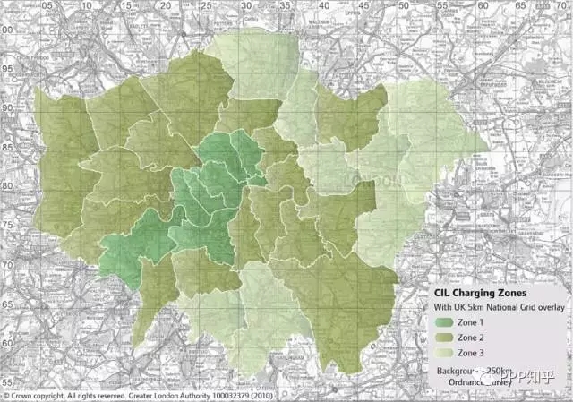 另一方面,對新建的房地產(chǎn)項(xiàng)目征收社區(qū)基建費(fèi)(CIL-Community Infrastructure Levy),涉及的社區(qū)基礎(chǔ)設(shè)施費(fèi)征收范圍如下圖所示,分為3檔稅率,分別為£50/平方米、£35/平方米、£20/平方米。