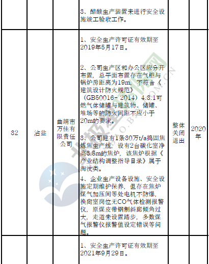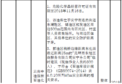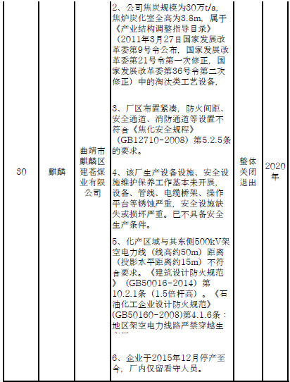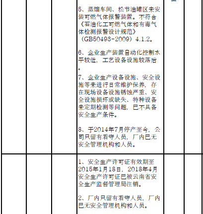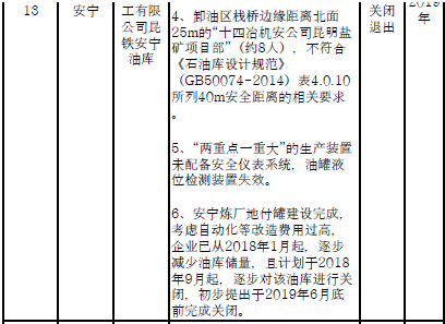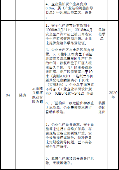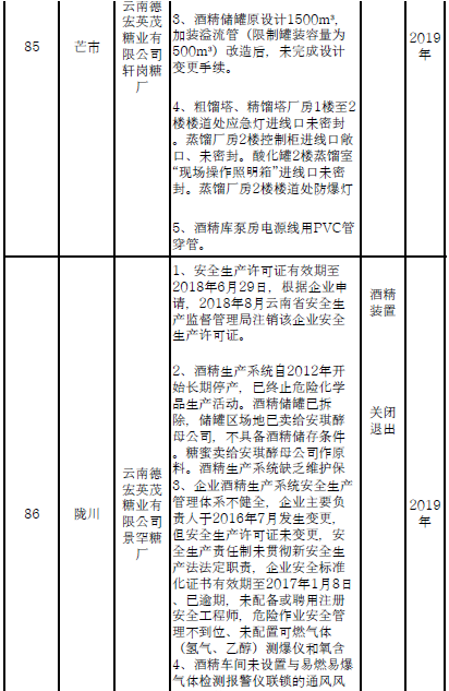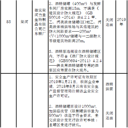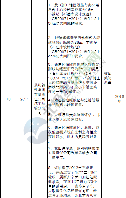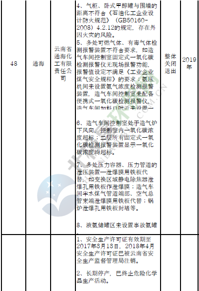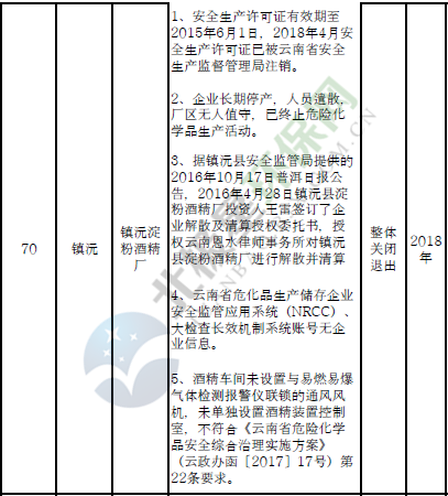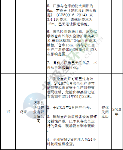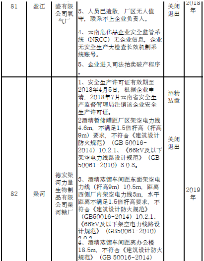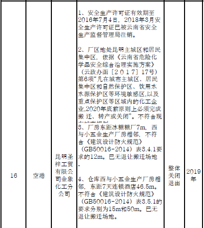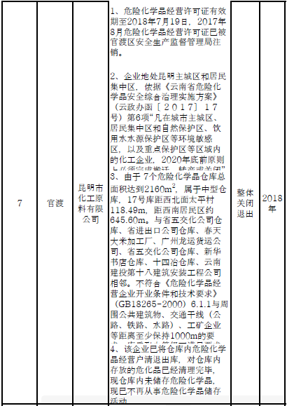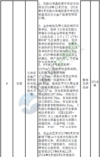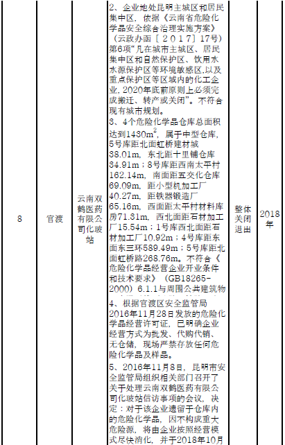 四、對8戶(詳見附件3)位于人員密集區(qū)、安全距離不足、工藝技術(shù)落后、存在重大隱患的危險化學(xué)品生產(chǎn)(儲存)企業(yè)進(jìn)行綜合整治,2020年底前全部完成,各相關(guān)企業(yè)具體完成時間由各州市政府結(jié)合本地實(shí)際確定。各州市政府要統(tǒng)籌制定重大隱患綜合整治方案,做到“一企一方案”并報省安委會辦公室。其中:昆明市2戶,曲靖市1戶,玉溪市1戶,楚雄州1戶,文山州1戶,西雙版納州1戶,大理州1戶。