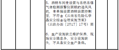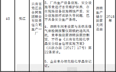 三、對37戶(詳見附件2)內(nèi)部安全距離不足、工藝技術(shù)和裝備水平低的危險化學(xué)品企業(yè)實(shí)施就地改造。其中:昆明市9戶,曲靖市5戶,玉溪市2戶,保山市1戶,楚雄州2戶,普洱市11戶,西雙版納州2戶,大理州1戶,德宏州1戶,怒江州1戶,臨滄市2戶。