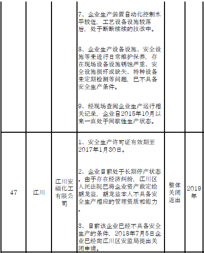 對91戶危險化學(xué)品生產(chǎn)(儲存)企業(yè)和部分生產(chǎn)裝置,雖不在城鎮(zhèn)人口密集區(qū),但由于不符合產(chǎn)業(yè)政策、不具備基本安全生產(chǎn)條件且無法整改的,實(shí)施關(guān)閉退出。
