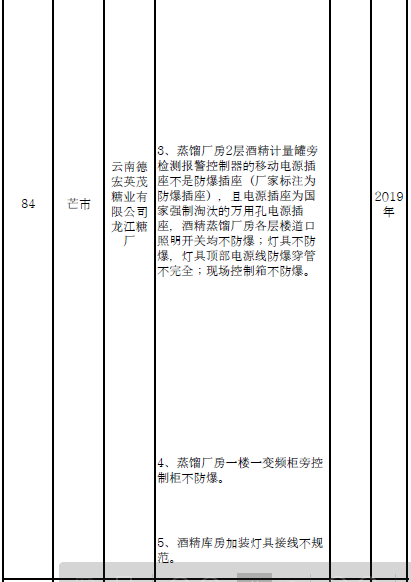 五、涉及重點(diǎn)監(jiān)管危險化工工藝的43戶企業(yè)、涉及重點(diǎn)監(jiān)管危險化學(xué)品的107戶企業(yè)以及213個重大危險源,各州市政府根據(jù)具體情況組織進(jìn)行整改。2019年10月底完成自動化控制和安全儀表系統(tǒng)改造升級工作。2019年10月底,未單獨(dú)設(shè)置控制室的乙醇生產(chǎn)企業(yè)按照規(guī)程要求完成改造,酒精生產(chǎn)車間的易燃易爆氣體檢測報警儀與通風(fēng)風(fēng)機(jī)實(shí)現(xiàn)聯(lián)鎖。