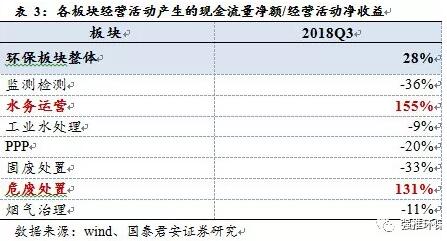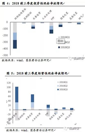 經(jīng)營現(xiàn)金流凈額方面:2018前三季度,環(huán)保行業(yè)整體凈額為55.9億元,受益于水務(wù)運(yùn)營與危廢處置板塊,現(xiàn)金流超前于收入確認(rèn)的行業(yè)屬性,其他板塊,現(xiàn)金流與收入的匹配性仍有待提高。