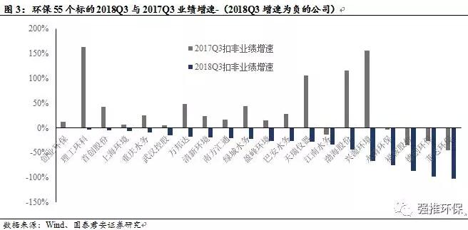 2018年前三季度:環(huán)保行業(yè)整體營業(yè)收入1073億元,同比增長23%,增速同比回落6pct;歸屬凈利潤142億元,同比6%,增速同比回落20pct;扣非凈利潤131億元,同比增7%,增速同比回落26pct。各個板塊的扣非凈利潤增速出現(xiàn)顯著回落。