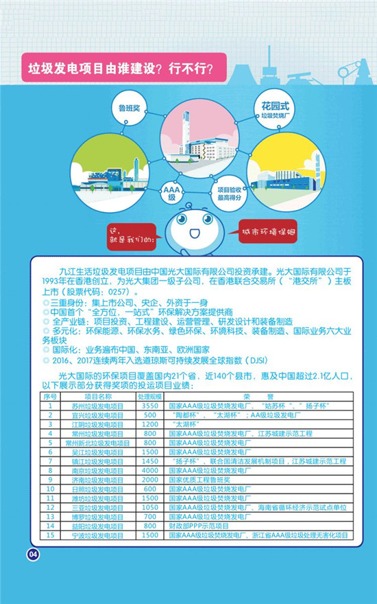 同杭州九峰垃圾焚燒發(fā)電項目一樣,九江垃圾焚燒發(fā)電項目也將由中國光大國際有限公司投資、建設(shè)、運營。據(jù)了解,光大國際在全國各地先后投資、建設(shè)、運營99個項目,日處理生活垃圾規(guī)模超過8萬噸,成為國內(nèi)垃圾焚燒發(fā)電行業(yè)領(lǐng)頭羊。光大國際所投資建設(shè)的垃圾發(fā)電項目均采用機(jī)械爐排爐工藝,煙氣排放執(zhí)行最為嚴(yán)格的歐盟2010標(biāo)準(zhǔn),煙氣監(jiān)測系統(tǒng)與當(dāng)?shù)丨h(huán)保部門在線聯(lián)網(wǎng),各種排放指標(biāo)向社會及時公布。垃圾滲濾液的綜合處理開創(chuàng)了國內(nèi)“先河”,以一個個環(huán)境優(yōu)美的花園式垃圾焚燒發(fā)電項目,向社會、居民、各地政府鄭重兌現(xiàn)了承諾。