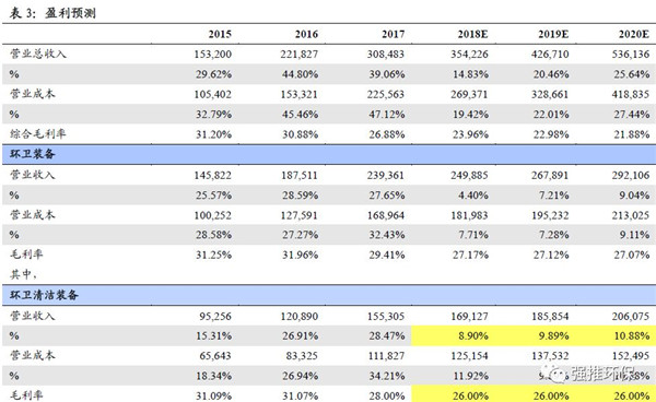 環(huán)衛(wèi)服務(wù):2018/2019/2020年?duì)I收增速:50%/50%/50%;2018/2019/2020年毛利率:17%/17%/17%。