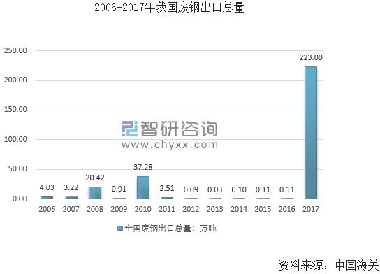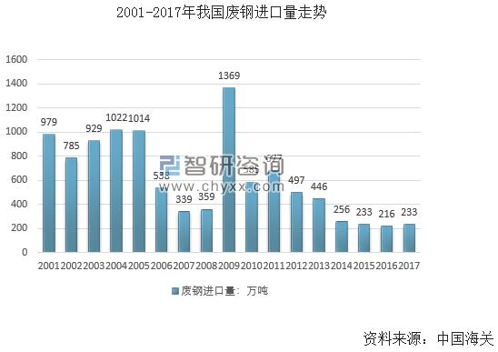 近年來,我國鋼鐵在我國鋼鐵產(chǎn)能過剩的大背景下,我國廢鋼進(jìn)口量自2009-2012年后,逐年走低,進(jìn)口資源所占比例不斷減小,2017年,我國廢鋼進(jìn)口量大約為233萬噸。2016年為216萬噸,進(jìn)口量小幅回升。