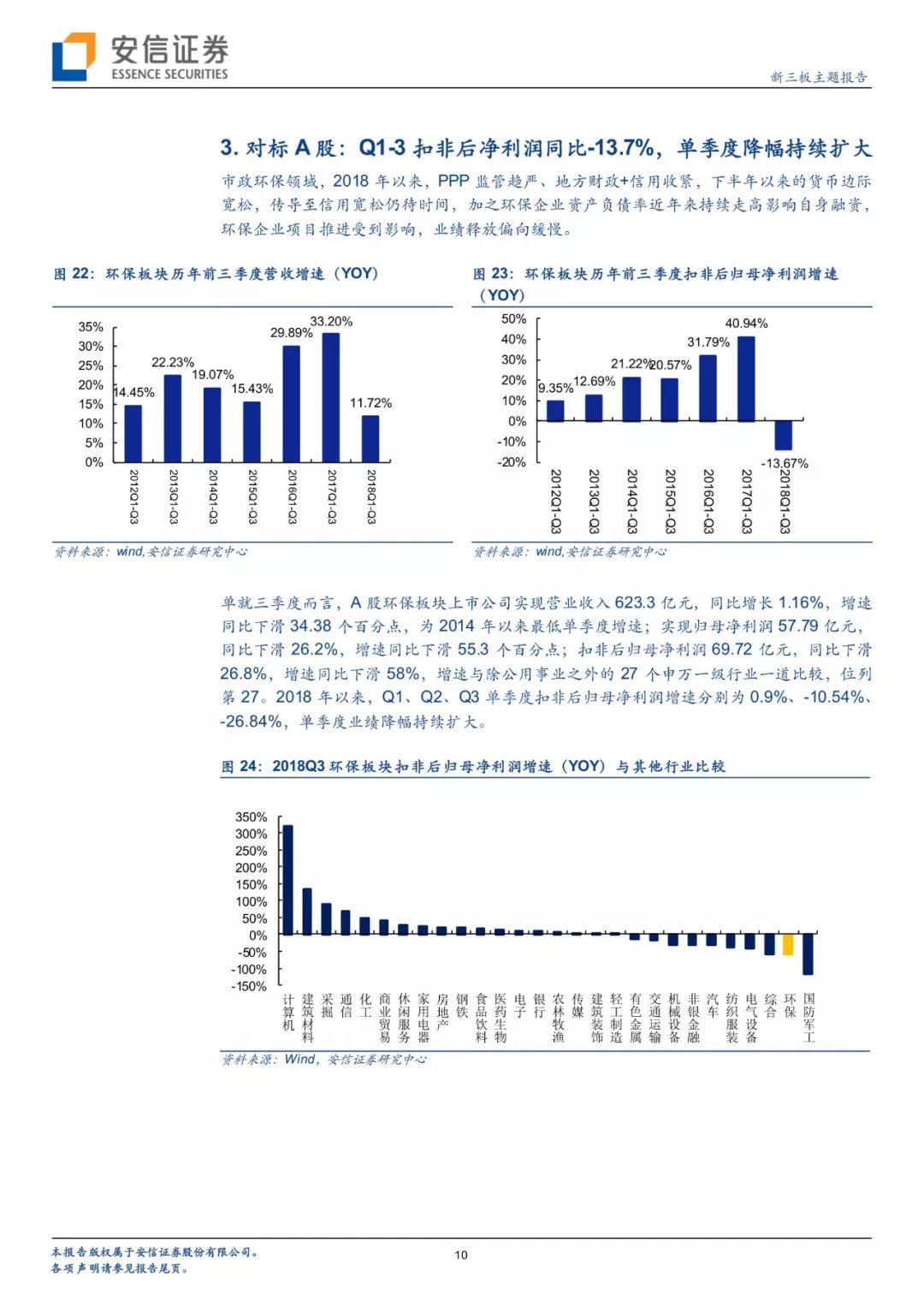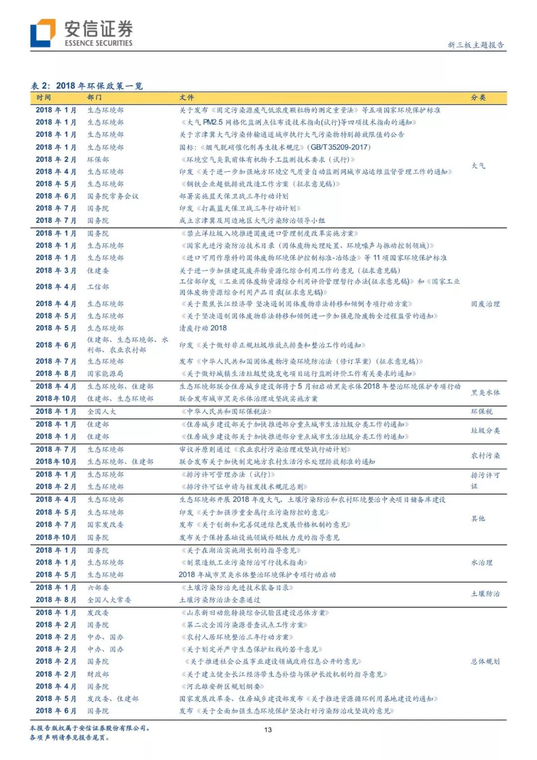 從政策進(jìn)展看環(huán)境變遷路徑,環(huán)境治理已經(jīng)實(shí)現(xiàn)圍繞大氣+水+土壤三大維度建立起“環(huán)保稅+排污許可證”兩大保障、從城市走向農(nóng)村的一體化大環(huán)保格局。自年初環(huán)保稅、排污許可證實(shí)施以來,政策力度不減且頻頻出臺(tái),在肯定我國環(huán)境治理已取得階段性的勝利的同時(shí),進(jìn)行大氣、水、固廢、土壤等細(xì)分領(lǐng)域的深化推進(jìn)。我們對(duì)于2018年以來各細(xì)分板塊政策及變遷進(jìn)行了梳理。而新三板擁有400家公司,覆蓋了大氣治理、水治理、固廢治理等各個(gè)領(lǐng)域。我們繼續(xù)看好環(huán)保板塊,建議從政策推進(jìn)進(jìn)程中發(fā)掘潛在機(jī)會(huì),建議關(guān)注水治理、固廢治理和再生資源板塊投資機(jī)會(huì)。