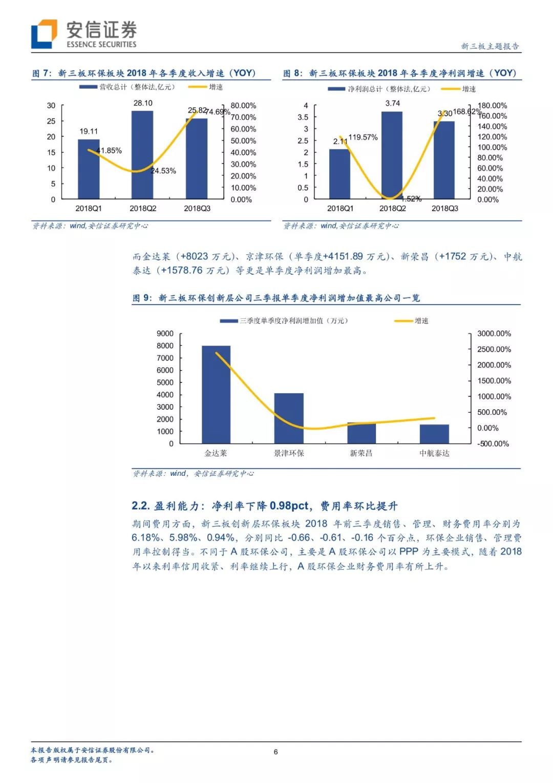 盈利能力:1)期間費(fèi)用:新三板環(huán)保板塊2018年前三季度銷售、管理、財(cái)務(wù)費(fèi)用率分別為6.18%、5.98%、0.94%,同比-0.66、-0.61、-0.16個(gè)百分點(diǎn),銷售、管理費(fèi)用率控制得當(dāng)。財(cái)務(wù)費(fèi)用率低于A股環(huán)保公司(A股為2%-3%),主要原因是因?yàn)锳股以PPP為主要模式,2018年以來利率信用收緊、利率繼續(xù)上行。2)2018Q1-Q3,新三板環(huán)保板塊整體毛利率和凈利率為30.29%、11.56%,略高于A股整體,分別同比持平和-0.98個(gè)百分點(diǎn)。