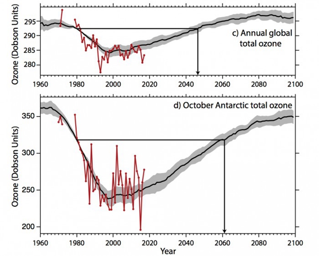 在《2018年臭氧層耗損科學(xué)評(píng)估(Scientific Assessment of Ozone Depletion: 2018)》中,研究人員收集了有關(guān)地球平流層臭氧層恢復(fù)的監(jiān)測(cè)數(shù)據(jù)。如果沒有臭氧,地球上的生命將會(huì)受到來(lái)自太陽(yáng)大量有害紫外線的影響,這類紫外線將會(huì)對(duì)人類的未來(lái)造成毀滅性影響。