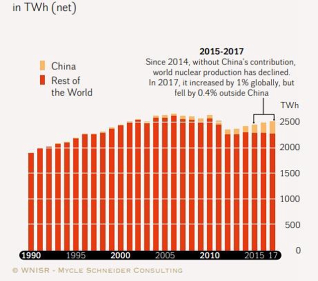 然而,如果將中國(guó)排除在統(tǒng)計(jì)數(shù)據(jù)外,結(jié)果會(huì)截然不同,報(bào)告顯示如果這樣計(jì)算,全球核電發(fā)電量會(huì)出現(xiàn)連續(xù)第三年下降。