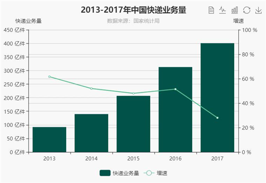 網(wǎng)購的發(fā)達促進了快遞市場的發(fā)展。據(jù)國家郵政局統(tǒng)計,2013-2017年中國快遞業(yè)務量正在以驚人的速度上升。91.9億到400億,短短五年間這個數(shù)字竟然翻了四點三倍。