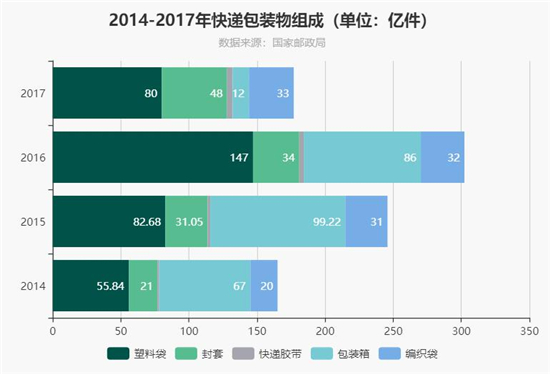 快遞業(yè)務的繁榮在促進經(jīng)濟飛速發(fā)展的同時也產(chǎn)生了巨大的環(huán)保負擔。其中最突出的問題就是快遞包裝所帶來的資源浪費以及環(huán)境污染。一件普通的快遞,根據(jù)商品種類的不同,一般會有塑料袋、封套、快遞膠帶、包裝箱以及編織袋五大類包裝。根據(jù)國家郵政局統(tǒng)計,2016年我國快遞包裝塑料袋使用量達147億,包裝箱達88億,快遞膠帶3.3億卷。在節(jié)能減排的號召下2017年狀況有所改觀,但形式依舊嚴峻。