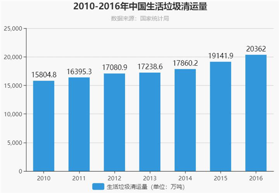 2010年到2016年的七年間,全國年垃圾清運總量從15804.8萬噸增長到20362萬噸,其中快遞貢獻了不少垃圾。