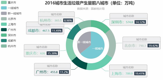 從下面的數(shù)據(jù)圖可以看出,生活垃圾產(chǎn)生量排位靠前的城市也都是經(jīng)濟發(fā)達、快遞業(yè)務繁榮的城市,全部為一線和新一線城市。其中一線城市所占比高達64.15%。