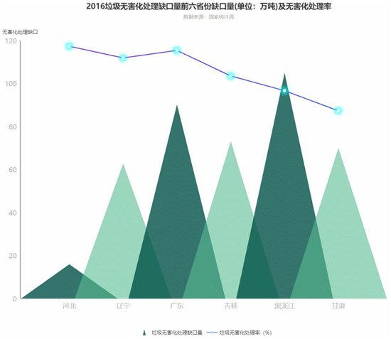 從下圖我們還可以得知,盡管我國的垃圾無害化處理率相當高,基本在70%以上,但由于垃圾清運量龐大,垃圾缺口量依舊龐大(缺口量為垃圾清運量減去垃圾無害化處理量)。其中黑龍江缺口量達105萬噸,廣東缺口量達90.3萬噸。這些未經(jīng)無害化處理的垃圾是環(huán)境污染的重要源頭。