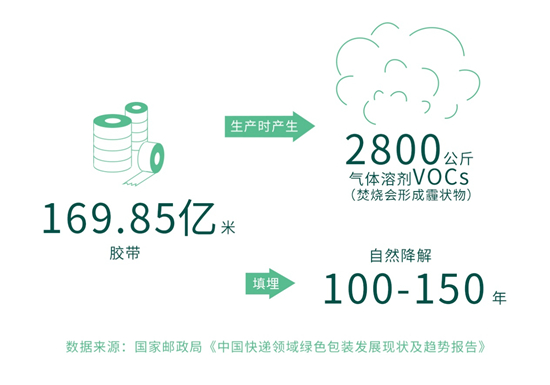 《中國快遞領域綠色包裝發(fā)展現(xiàn)狀及趨勢報告》顯示,2015 年 400 多萬噸包裝垃圾中,消耗編織袋約 31 億條、塑料袋約 82.68 億個、封套約 31.05 億個、包裝箱約 99.22 億個、膠帶約 169.85 億米、內(nèi)部緩沖物約 29.77 億個。而這些膠帶在生產(chǎn)過程中,會產(chǎn)生 2800 公斤氣體溶劑 VOCs(焚燒會形成霾狀物),如果填埋處理,實現(xiàn)自然降解需要 100-150 年。