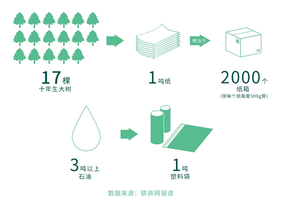 快遞包裝以紙張、塑料等形式為主,其原材料大多源于木材、石油等。根據(jù)相關專家測算,生產(chǎn)1噸紙需砍伐17棵十年生大樹,生產(chǎn)1噸塑料袋需消耗3噸以上石油?;厥章实鸵簿鸵馕吨速M生產(chǎn)資源。中國快遞協(xié)會副秘書長楊駿說,每年由快遞包裹帶來的包裝廢棄物達到百萬噸。