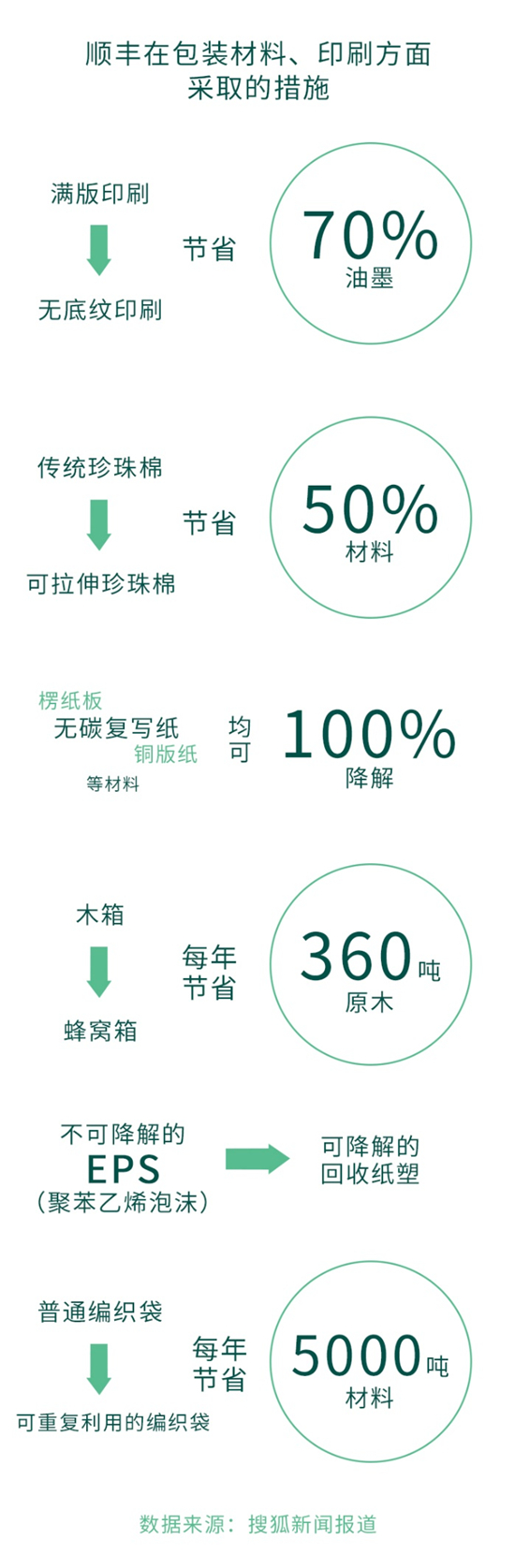 例如順豐在包裝材料、印刷方面,將滿版印刷改為無底紋印刷,可以節(jié)省油墨用量70%;利用可拉伸珍珠棉代替?zhèn)鹘y(tǒng)珍珠棉,節(jié)省材料50%;在環(huán)保材料方面,使用的楞紙板、無碳復寫紙、銅版紙等材料均可100%降解,還使用蜂窩箱代替木箱包裝,每年可節(jié)約原木360噸;利用可降解的回收紙塑代替不可降解的EPS(聚苯乙烯泡沫)材料;除此之外,使用可重復利用的編織袋代替普通編織袋,每年可節(jié)省材料5000多噸。