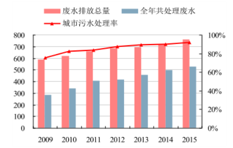2015 年我國污水排放總量達 759.2 億噸,較 2014 年同比增長 6%,2015 全年共處理污水 527.7 億噸,同比增長 6.8%,處理廢水量與廢水排放總量的差距不斷縮小,廢水處理能力不斷上升。2015 年我國城市污水 561.3億噸,處理率已經(jīng)到達 91.8%,根據(jù)《“十三五”全國城鎮(zhèn)污水處理及再生利用設(shè)施建設(shè)規(guī)劃》的要求,到 2020 年,城市污水處理率要達到 95%,仍有一定的發(fā)展空間。