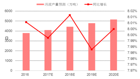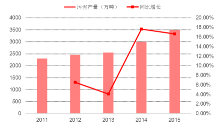 根據(jù)報告,2015 年我國城鎮(zhèn)污泥年產(chǎn)量達到 3500 萬噸,較 2014 年同比增長 16%。據(jù)中國產(chǎn)業(yè)信息網(wǎng)的測算,未來幾年我國污泥產(chǎn)生量將逐年穩(wěn)步增加,預計年增長率為 8%左右, 2020 年達到5157 萬噸。