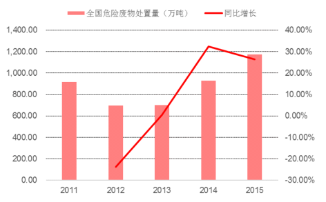 隨著我國經(jīng)濟的發(fā)展與工業(yè)化水平的提高,全國危廢的產(chǎn)生量呈現(xiàn)出迅速增加的態(tài)勢。根據(jù)數(shù)據(jù),近年來,全國危廢綜合利用處置率保持在 80%左右。2015 年危廢產(chǎn)生量 3976 萬噸,綜合利用量 2050萬噸,處置量 1174 萬噸,綜合利用處置率為 81.08%。