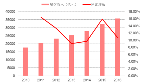 最新消費數(shù)據(jù)顯示,2016 年,餐飲收入 35779 億元,同比增長 10.8%,其中 12 月份餐飲收入 3353 億元,同比增長 10.6%;。隨著餐飲行業(yè)的蓬勃發(fā)展,衍生品餐廚垃圾的產(chǎn)生量也在增加。