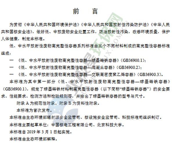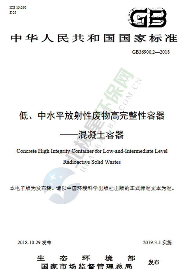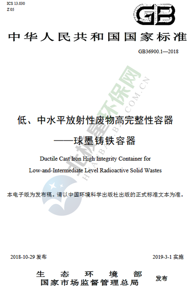 為貫徹《中華人民共和國環(huán)境保護法》《中華人民共和國放射性污染防治法》《中華人民共和國核安全法》,防治放射性廢物污染,保障人體健康,現(xiàn)批準(zhǔn)《低、中水平放射性固體廢物包安全標(biāo)準(zhǔn)》《低、中水平放射性廢物高完整性容器——球墨鑄鐵容器》《低、中水平放射性廢物高完整性容器——混凝土容器》《低、中水平放射性廢物高完整性容器——交聯(lián)高密度聚乙烯容器》等4項標(biāo)準(zhǔn)為國家放射性污染防治標(biāo)準(zhǔn),并由生態(tài)環(huán)境部與國家市場監(jiān)督管理總局聯(lián)合發(fā)布。