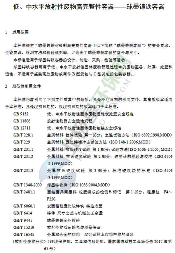 二、低、中水平放射性廢物高完整性容器——球墨鑄鐵容器(GB 36900.1-2018);