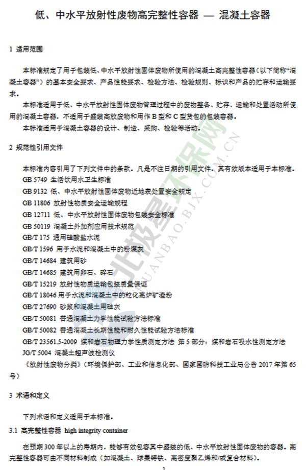三、低、中水平放射性廢物高完整性容器——混凝土容器(GB 36900.2-2018);