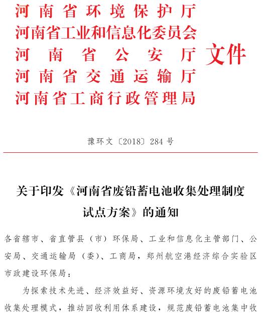 我省是鉛蓄電池生產(chǎn)、消費和再生利用大省。長期以來,由于廢鉛蓄電池回收體系和相關(guān)制度不完善,廢鉛蓄電池無序回收引起非法冶煉、含鉛廢酸非法傾倒的現(xiàn)象時有發(fā)生,對生態(tài)環(huán)境和公眾健康造成了嚴重影響。中共河南省委對此高度重視,將“開展廢鉛蓄電池收集處理制度試點”列入省委全面深化改革領(lǐng)導小組 2018 年工作要點。開展廢鉛蓄電池收集處理制度試點工作,探索廢鉛蓄電池集中收集、跨區(qū)域轉(zhuǎn)運方式和全過程溯源管理模式,對提高廢鉛蓄電池收集、貯存、運輸、再生利用全過程規(guī)范化管理水平,有效遏制廢鉛蓄電池違規(guī)回收、非法冶煉、非法傾倒行為,實現(xiàn)資源循環(huán)和環(huán)境保護雙重效益,具有重要的意義。