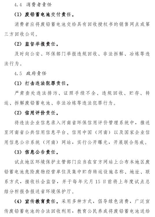 (一)落實屬地責任。試點任務率先在安陽、新鄉(xiāng)、焦作、許昌四市開展,四市人民政府要切實履行對本行政區(qū)域環(huán)境質(zhì)量負責的法定職責,充分認識廢鉛蓄電池違規(guī)收集、非法冶煉、含鉛廢酸非法傾倒的嚴重危害,建立健全廢鉛蓄電池收集處理責任制度和考核體系,督促有關(guān)部門和縣級政府履職盡責。