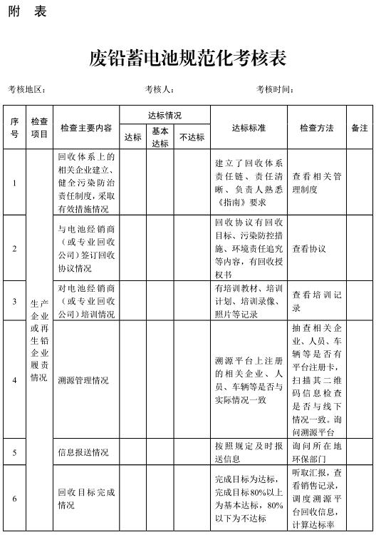 到 2018 年底,構(gòu)建廢鉛蓄電池集中收集、跨區(qū)域轉(zhuǎn)運方式和全過程溯源管理模式,年底總結(jié)試點地區(qū)經(jīng)驗,在全省范圍內(nèi)推行。到 2019 年底,試點企業(yè)落實廢鉛蓄電池規(guī)范化管理制度,建成廢鉛蓄電池逆向物流回收體系。到 2020 年底,試點企業(yè)的廢鉛蓄電池規(guī)范收集處理率不低于 40% 。