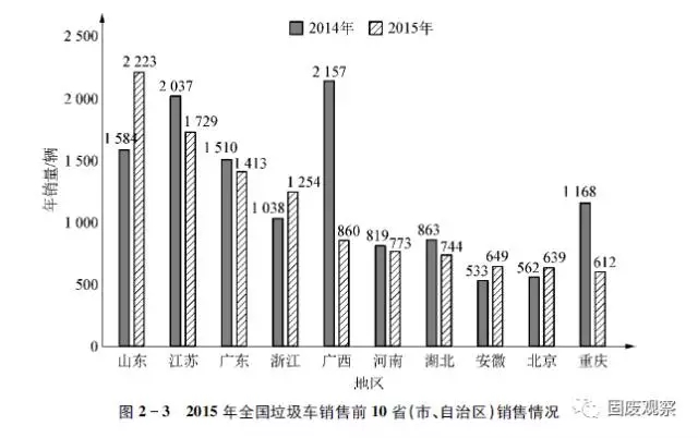 2015年,全國垃圾車銷量前十的省(市、自治區(qū))分別為山東、江蘇、廣東、浙江、廣西、河南、湖北、安徽、北京和重慶等,累計(jì)銷量均在600輛以上,銷量合計(jì)10896輛。