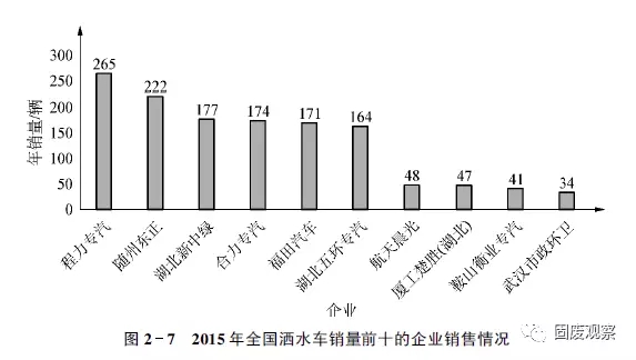 2015年,全國灑水車銷量前10企業(yè)合計(jì)銷售灑水車6462輛,同比增長3.54%,市場份額84.01%,同比提升8.63%。其中,程力專汽是2015年全國灑水車銷售企業(yè)中唯一一家灑水車?yán)塾?jì)銷量超過2000輛且在2400輛以上的企業(yè),同比增長在12%以上,市場份額在31%以上,同比提升5.49%。東風(fēng)集團(tuán)排名第二,累計(jì)銷量1409輛,市場份額在18%以上。隨州東正累計(jì)銷量超過600輛,市場份額近8%,排名第3。其余企業(yè)累計(jì)銷量均在500輛以下。
