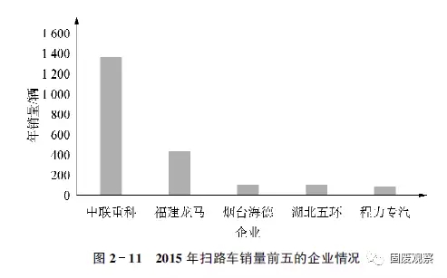 2015年全國銷售掃路車的前5企業(yè)合計(jì)銷售掃路車2094輛,在2015年全國掃路車總銷量(下同)中的份額達(dá)到85.16%。其中,中聯(lián)重科以1362輛的銷量(同比增長在24%以上)和55.39%的占有份額(同比下降0.42 %)高居行業(yè)榜首,該企業(yè)也是2015年全國銷售掃路車企業(yè)中唯一一家掃路車銷量超過1000輛且在1300輛以上的企業(yè),福建龍馬環(huán)衛(wèi)裝備累計(jì)銷量在430輛以上,同比增長91.56%,占有份額在17%以上,排名第二(詳見表2-11),其余企業(yè)累計(jì)銷量均在110輛以下。