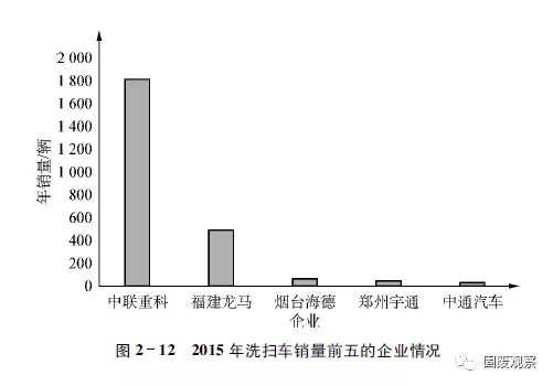 2015年我國洗掃車市場累計(jì)銷量前5企業(yè)合計(jì)銷售洗掃車2448輛,在2015年全國洗掃車總銷量(下同)中的占有份額合計(jì)實(shí)現(xiàn)90.67%。其中,中聯(lián)重科累計(jì)實(shí)現(xiàn)銷量1820輛,是2015年全國銷售洗掃車企業(yè)中唯一一家洗掃車?yán)塾?jì)銷量超過1000輛且在1800輛以上的企業(yè),同比增長在47%以上,占有份額超過67%,同比下降4.10%,高居全國洗掃車行業(yè)榜首;福建龍馬環(huán)衛(wèi)以累計(jì)銷量491輛,18%以上的占有份額屈居第二(詳見表2-12),其余企業(yè)累計(jì)銷量均在70輛以下。