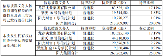 據了解,截至本公告日龍凈環(huán)保股東陽光集團在上海證券交易所通過集中交易方式完成0.53億股的增持。權益變動前陽光集團持股20%,權益變動后持股比例為25%。