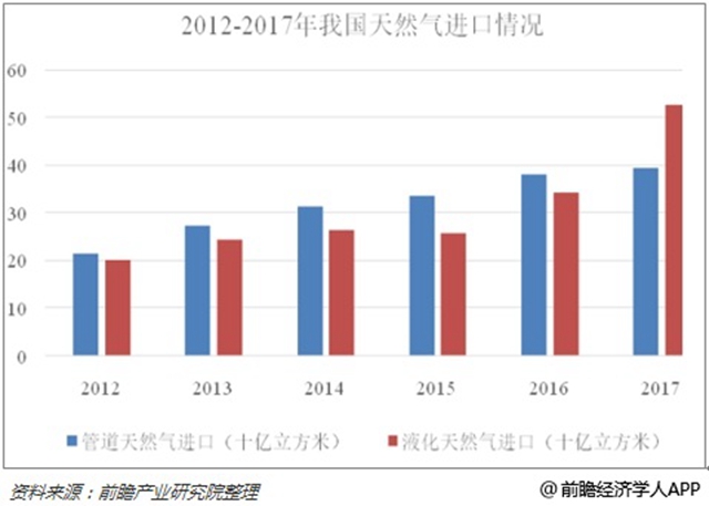 受國(guó)內(nèi)天然氣需求拉動(dòng)我國(guó)天然氣進(jìn)口量高速增長(zhǎng)。進(jìn)口天然氣又分為進(jìn)口管道氣以及進(jìn)口LNG。2017年我國(guó)管道天然氣進(jìn)口量為394億立方米,進(jìn)口量同比增長(zhǎng)3.68%;液化天然氣進(jìn)口量為526億立方米,同比增長(zhǎng) 53.35%。