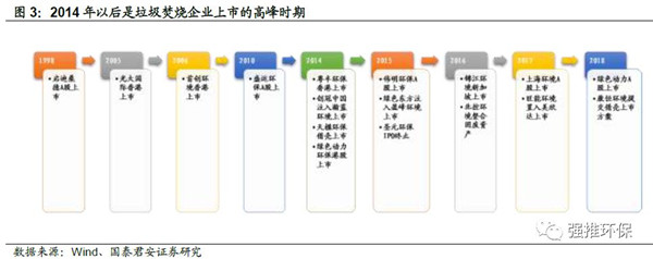 2014年及以后是我國垃圾焚燒企業(yè)上市的高峰時期。自1985年第一座垃圾焚燒廠在深圳建成,“十一五”期間垃圾焚燒行業(yè)開始發(fā)展,目前大部分項目是在2012年以后開始投運(yùn)。有了穩(wěn)定的運(yùn)營業(yè)績,垃圾焚燒的龍頭開始上市,除了光大國際、首創(chuàng)、北控、桑德等綜合型環(huán)保集團(tuán),2017年垃圾焚燒產(chǎn)能前22名的公司有10家是在2014年后上市或準(zhǔn)備上市。