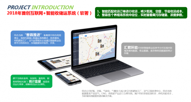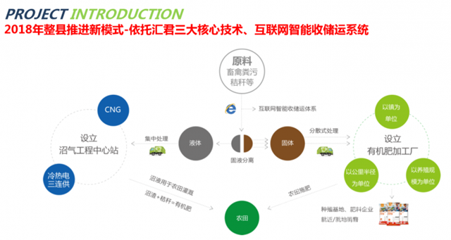 國家從2008年開始開始關(guān)注畜禽處理,2017年已經(jīng)開始形成規(guī)?;?。而匯君環(huán)能同時(shí)也從去年開始著手規(guī)劃整縣(市)資源化的處理,利用匯君模式,根據(jù)當(dāng)?shù)氐膶?shí)際情況,合理規(guī)劃沼氣工程中心站,另外以村鎮(zhèn)為單位、以公里半徑為單位、以養(yǎng)殖規(guī)模為單位,建立有機(jī)肥加工廠,采用智能化收儲(chǔ)運(yùn)平臺(tái),有效利用地方的政策,配合消納政策,實(shí)現(xiàn)全方位畜禽糞污資源化智能處理。