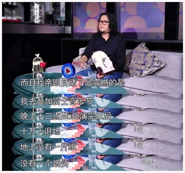矮大緊老師曾在節(jié)目中提到過,自己去東京參加富士音樂節(jié),活動結(jié)束時讓他感到非常震撼,十萬人退場地上竟然沒有一點(diǎn)垃圾。更還有一些標(biāo)榜自己“個性十足”的粉絲在午夜排起長隊(duì)等候扔垃圾。