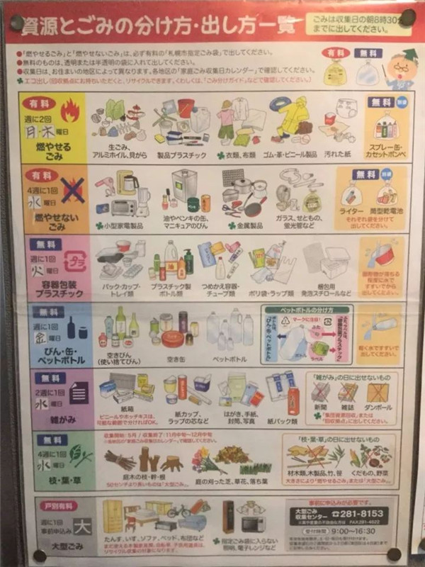 垃圾分類的大方向是以下幾類:可燃垃圾,不可燃垃圾,舊紙類,玻璃瓶,罐,塑料瓶,這個基本上全日本沒什么太大的差別。