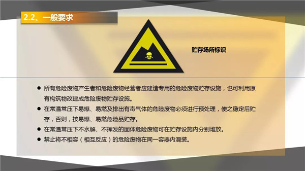 4危險(xiǎn)廢物識(shí)別標(biāo)志設(shè)置不規(guī)范或不設(shè)置。關(guān)于標(biāo)志或標(biāo)簽國(guó)際是有規(guī)定的,詳見(jiàn):《環(huán)境保護(hù)圖形標(biāo)志》(GB 15562.2)、《危險(xiǎn)廢物貯存污染控制標(biāo)準(zhǔn)》(GB 18597)危險(xiǎn)廢物倉(cāng)庫(kù)門外的警告標(biāo)志長(zhǎng)這樣的啦~