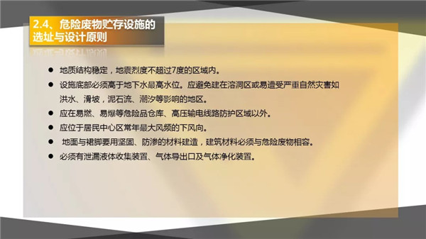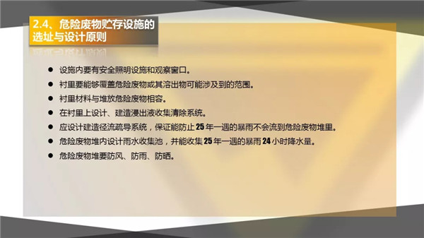 3)危險(xiǎn)廢物暫存場(chǎng)所選址要合理,并且需有防腐、防滲、防漏措施,及廢氣、廢水收集設(shè)施;