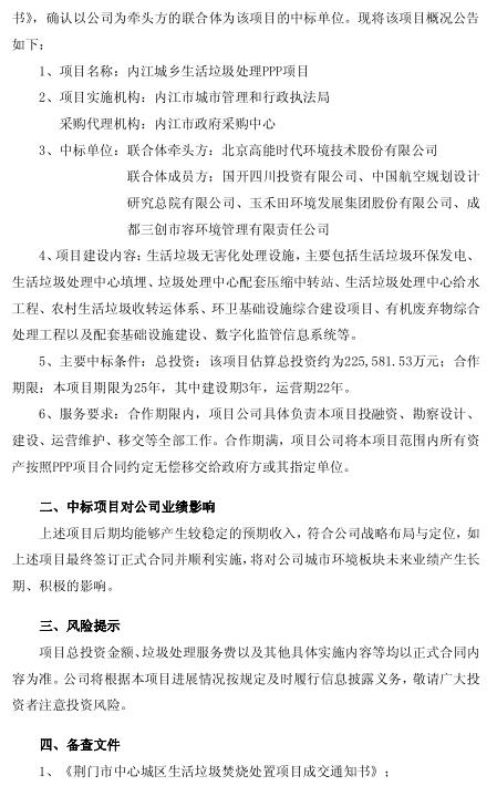 11月21日,高能環(huán)境發(fā)布公告稱,公司中標荊門市中心城區(qū)生活垃圾焚燒處置PPP項目,該總投資約為5.21億元;公司為牽頭方的聯(lián)合體中標內江城鄉(xiāng)生活垃圾處理PPP項目,該項目估算總投資約為22.59億元。公告如下: