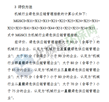 11月23日《機(jī)械行業(yè)綠色供應(yīng)鏈管理企業(yè)評價指標(biāo)體系》、《汽車行業(yè)綠色供應(yīng)鏈管理企業(yè)評價指標(biāo)體系》及《電器電子行業(yè)綠色供應(yīng)鏈管理企業(yè)評價指標(biāo)體系》公示征求意見,具體內(nèi)容如下: